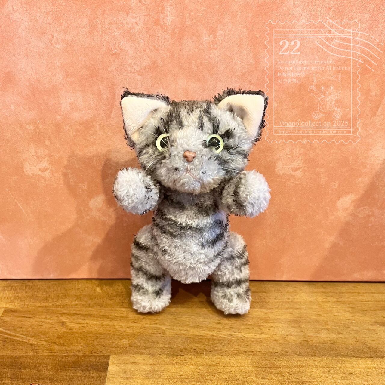 まんまるおめめが魅力の、サバトラ猫のぬいぐるみ「ぬいねこ」です。